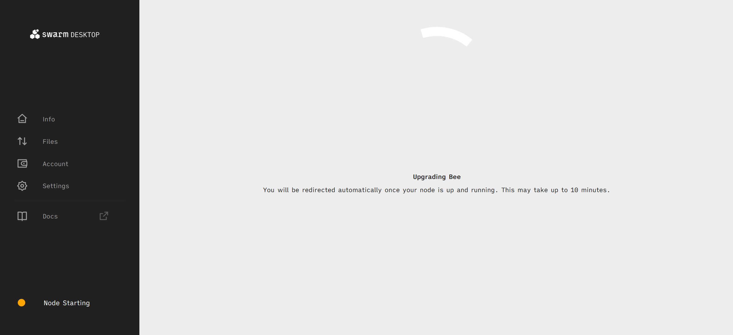 To get started, navigate to the Info tab and click the Setup wallet button. Click Use xDAI. Confirm that you have sufficient xDAI balance and click Proceed. Click Swap Now and Upgrade. Wait for the upgrade to complete. After the upgrade is complete, you will see several new sections within the Account tab: Chequebook, Stamps, and Feeds.